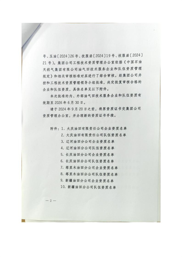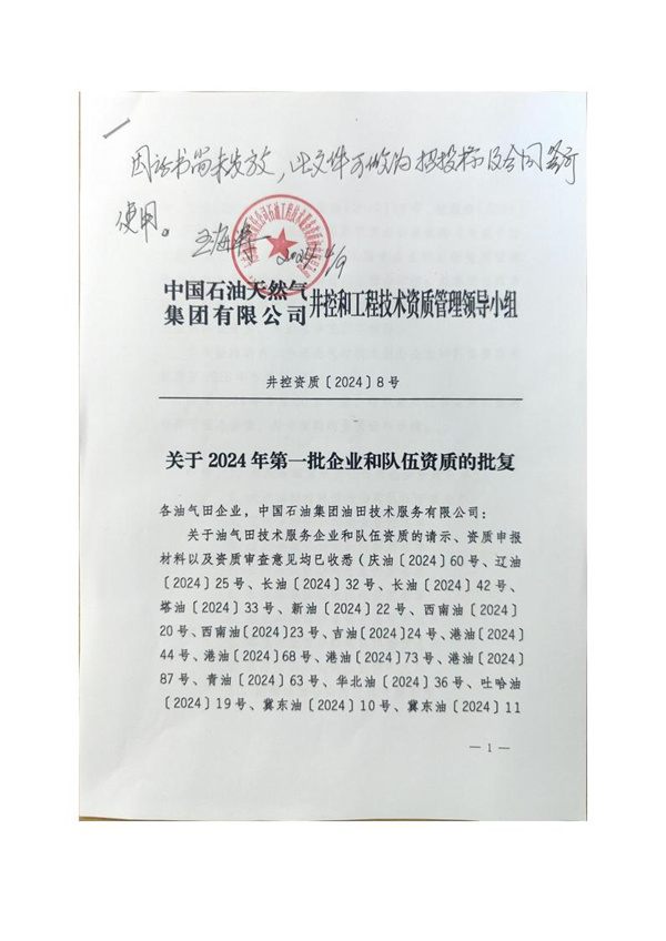 中石油“關(guān)于2024年第一批企業(yè)和隊(duì)伍資質(zhì)的批復(fù)”文件